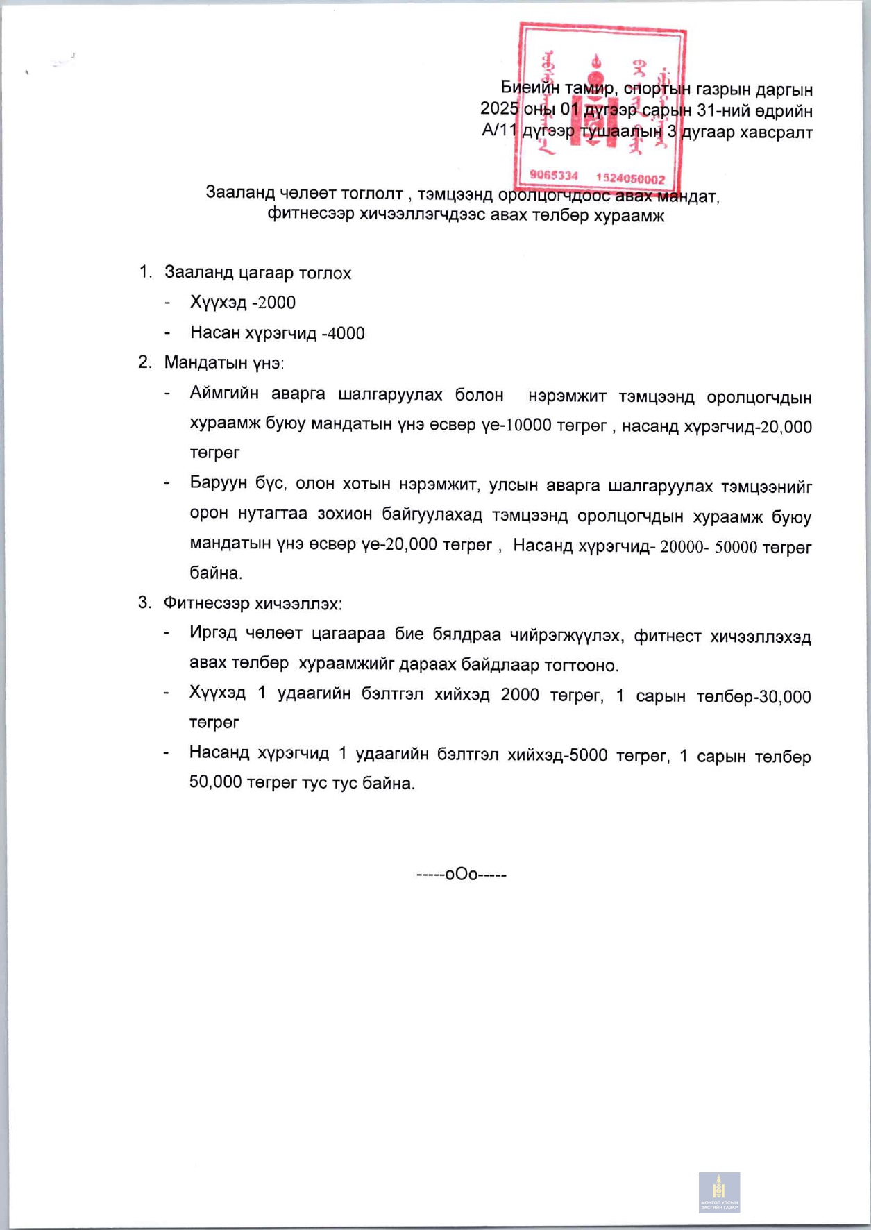 Тухайн байгууллагын хууль тогтоомжийн дагуу төвлөрүүлэх төлбөр, хураамж, зохицуулалт-2025