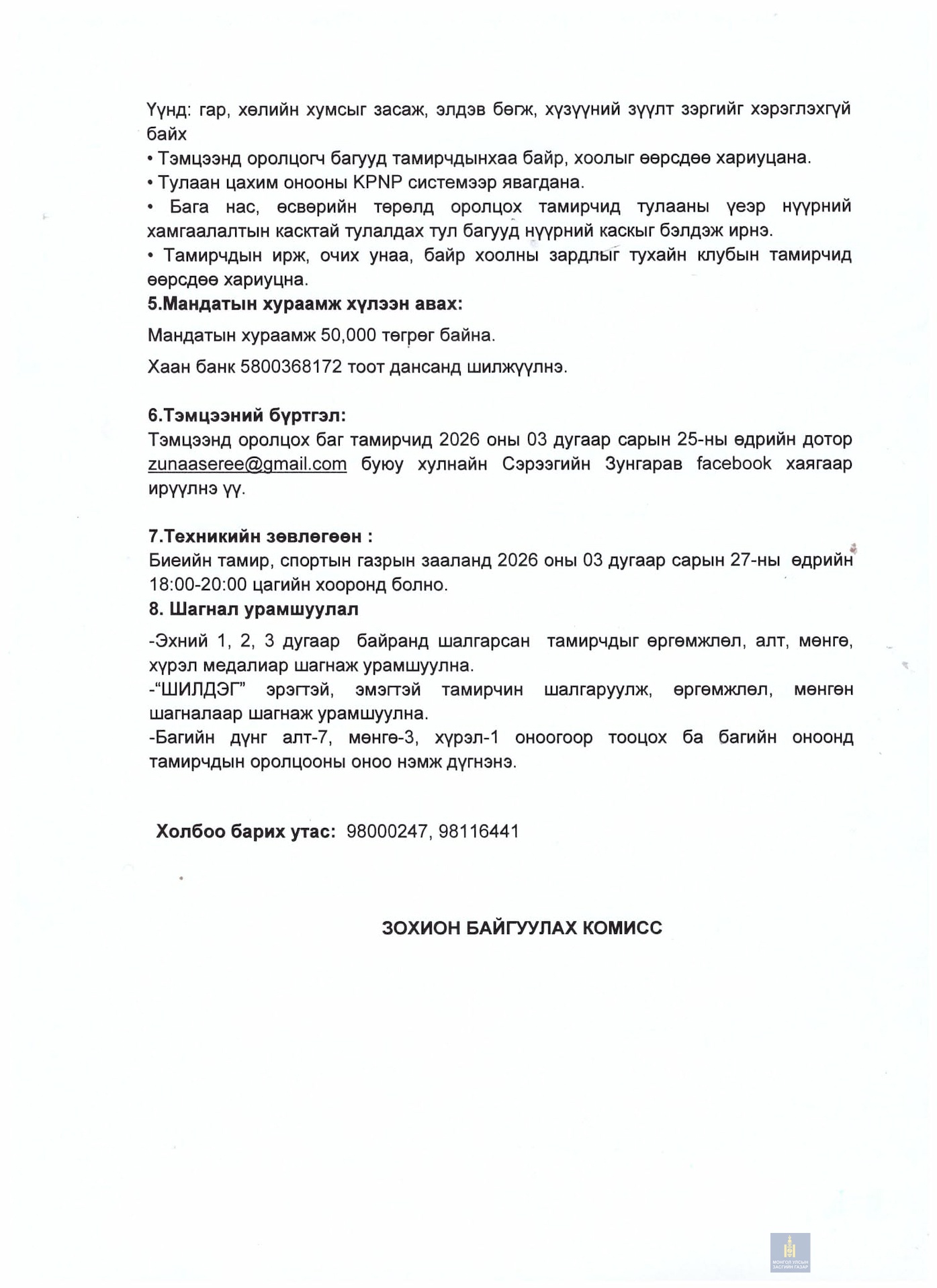 "ОЙРАДЫН ХҮЧ" тулааны нэгдсэн холбоо үүсэн байгуулагдсаны 10 жилийн ойн хүрээнд Таеквондогийн баруун бүсийн аварга шалгаруулах тэмцээн 2026 оны 3-р сарын 28-29 ний өдрүүдэд Увс аймгийн "СПОРТЫН ОРДОН"-д болно.