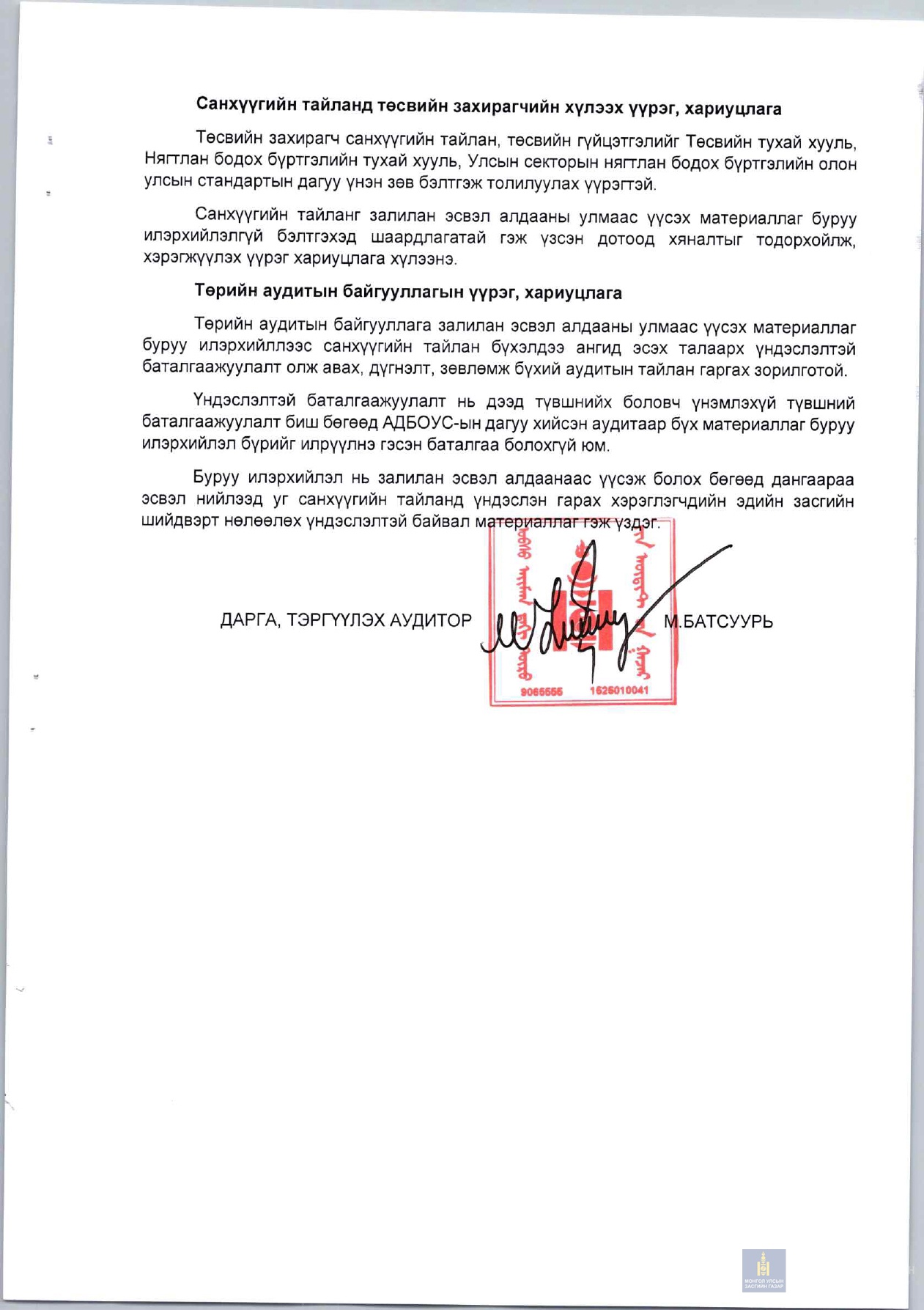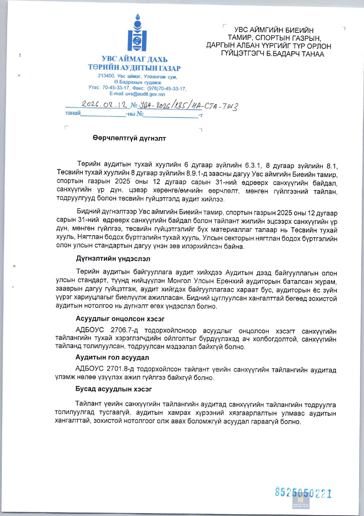 БИЕИЙН ТАМИР СПОРТЫН ГАЗРЫН 2025 ОНЫ САНХҮҮГИЙН ТАЙЛАН ТӨСВИЙН ГҮЙЦЭТГЭЛД ХИЙСЭН САНХҮҮГИЙН ТАЙЛАНГИЙН АУДИТ